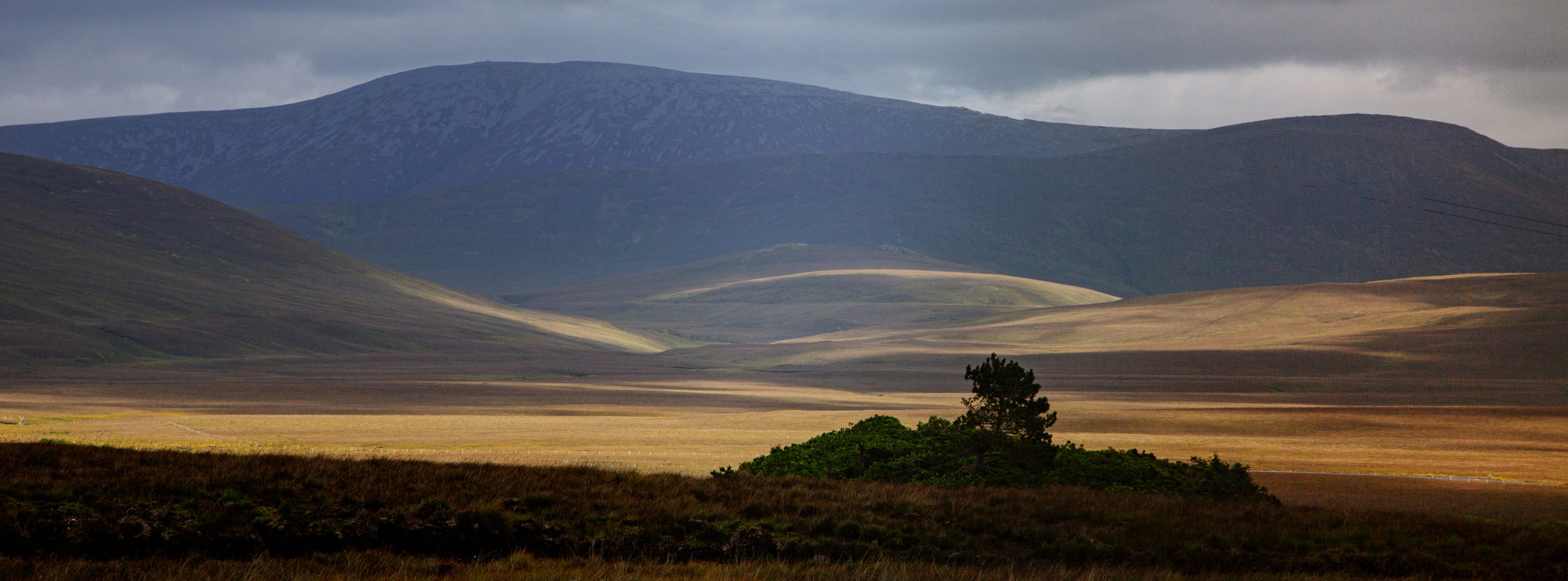 It was a very overcast day with plenty of intermittent showers and all I was doing was scouting for possible locations for good pictures that I could take another time. Luckily I had the camera ready and just as I was looking at this location a gap appeared in the clouds and sent searchlights of sunlight across the mountain and bog.