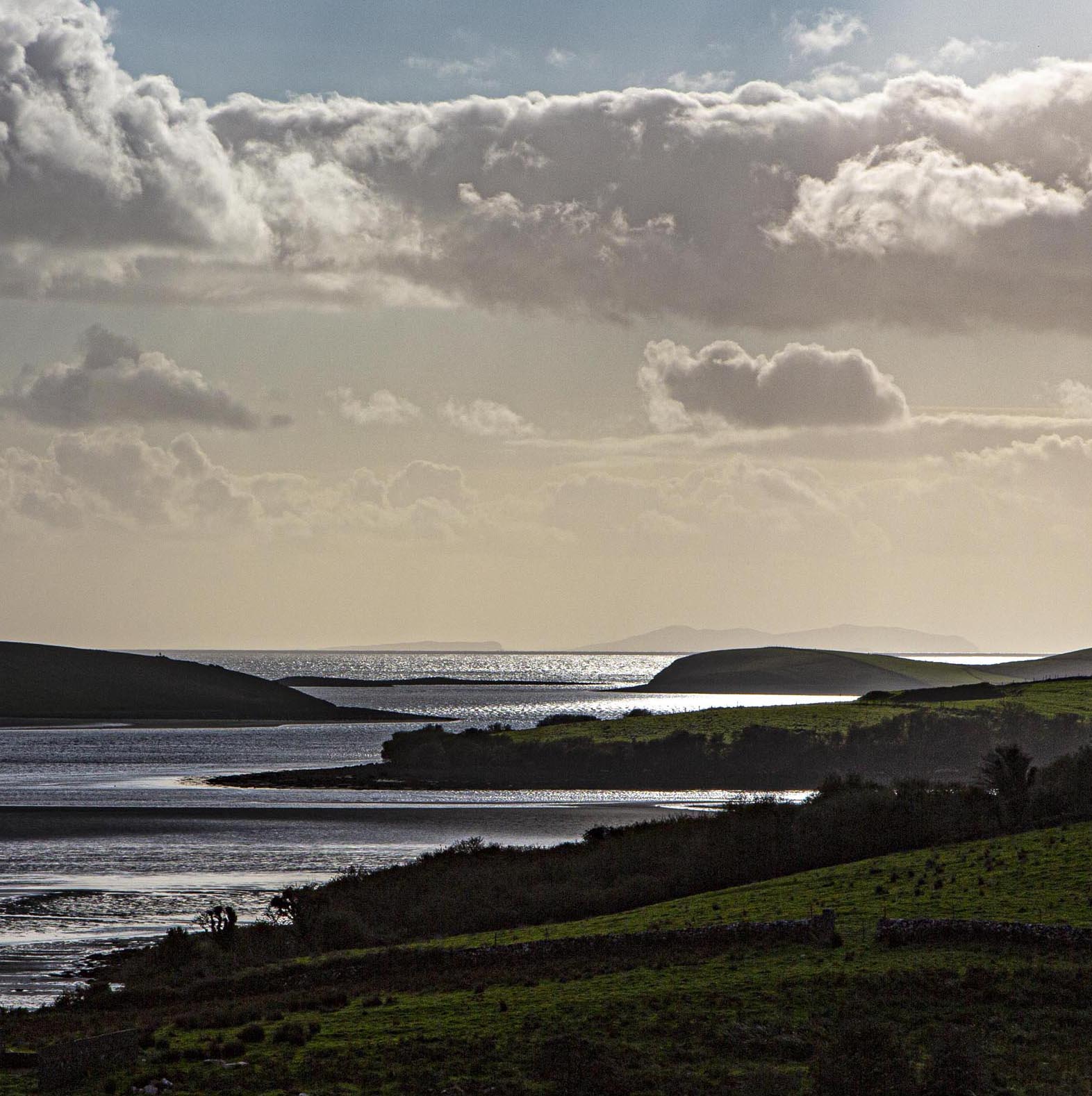 Looking west along the Atlantic coastline of the the west of Ireland always rewards the viewer, especially in Clew Bay. The tidal channels between the islands carry your eye to the bright horizon.