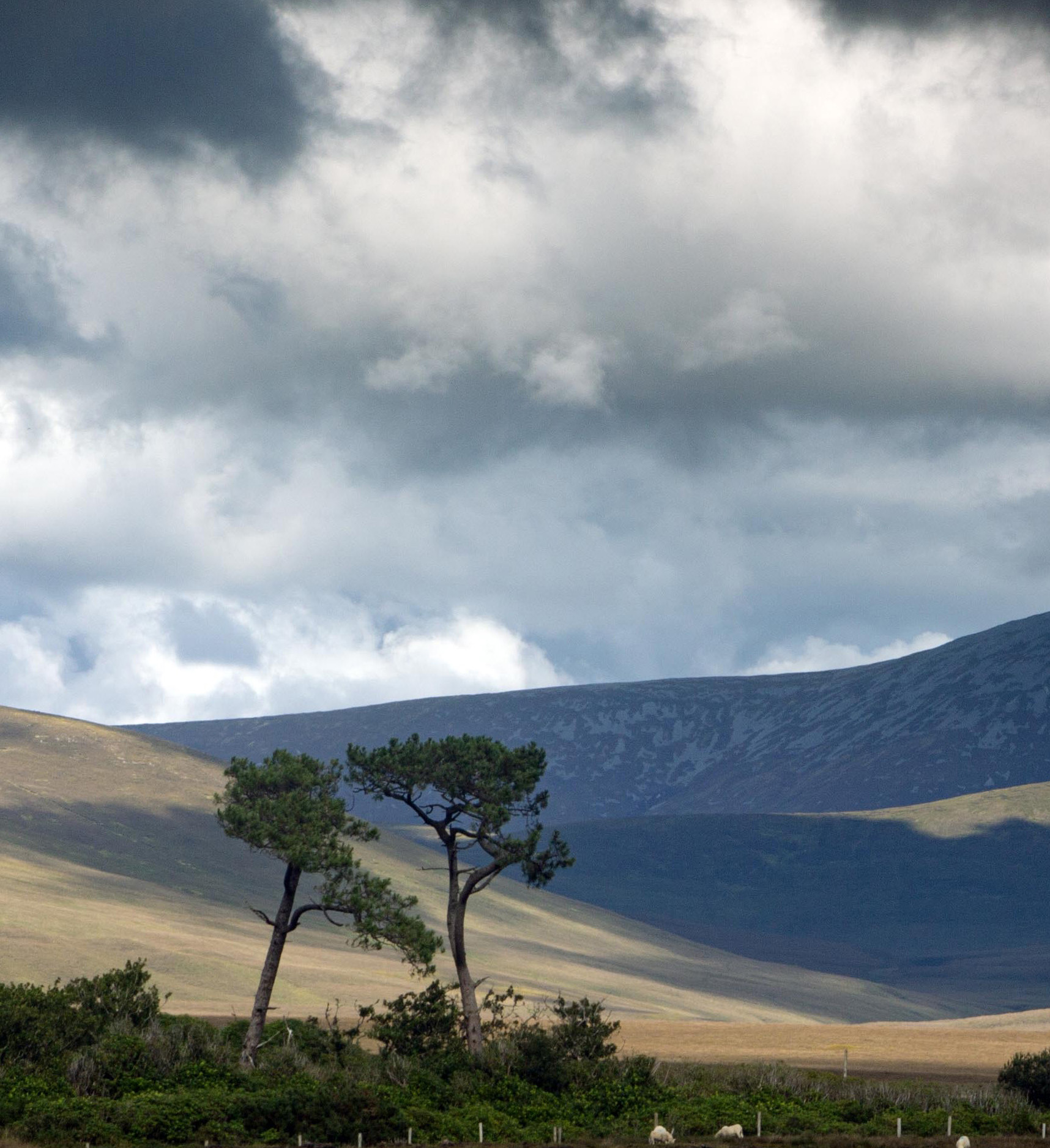 Two lone pine trees stand guard as the shadow of the clouds race across the Nephin Beg mountains.