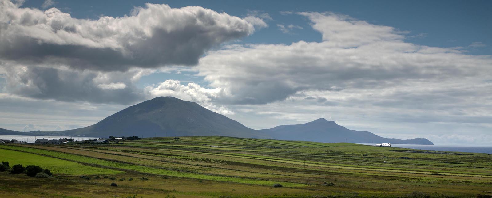 The linear field boundaries stretching for hundreds of meters are evidence that many more people lived off the land here in earlier days than do now. Today, this patchwork pattern enhances its impressive beauty. Two miles to the south lies Achill Island dominated by Sliabh Mór and the towering cliffs of Achill Head.