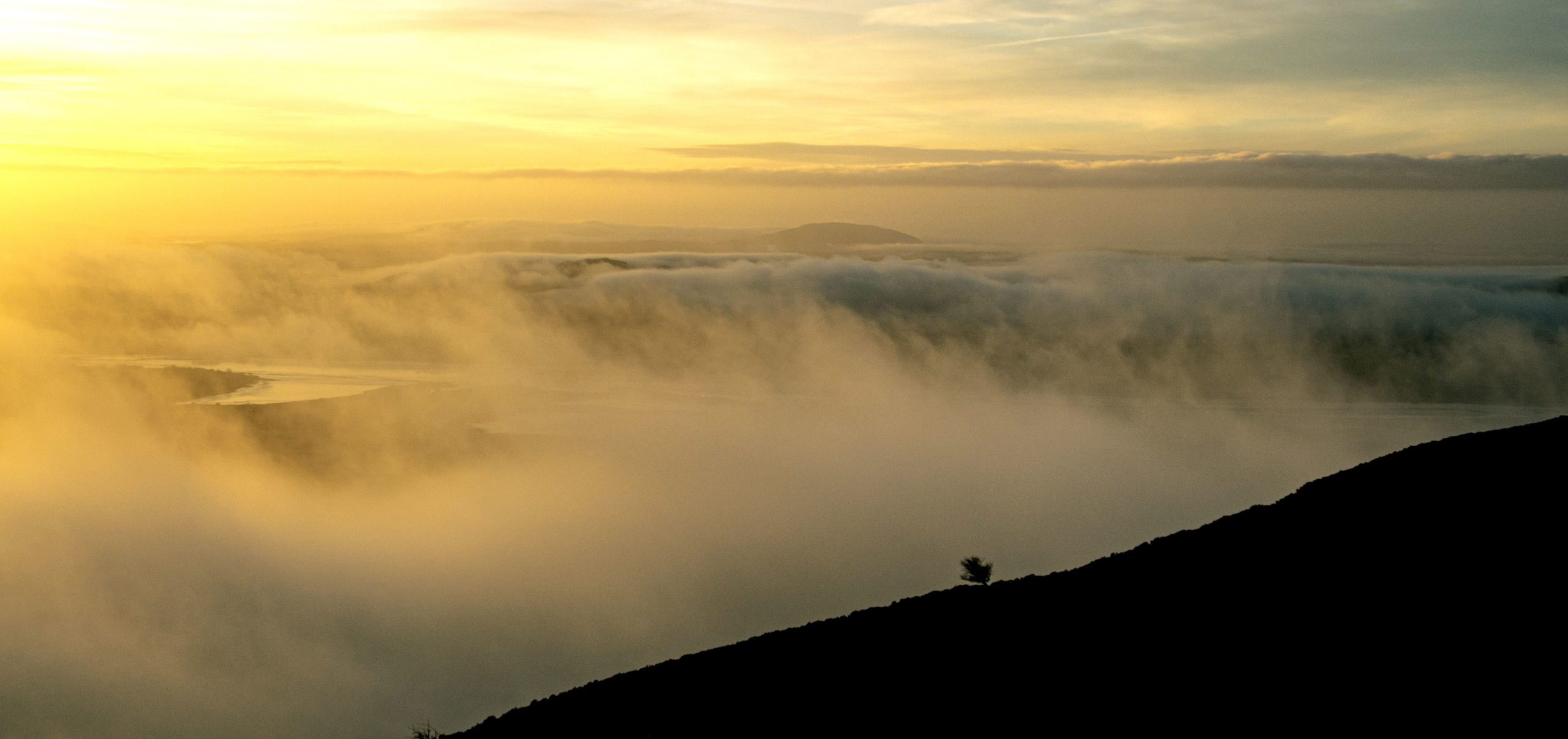 Early on a new year morning on Knocknarea, the rising sun lights up the mist.