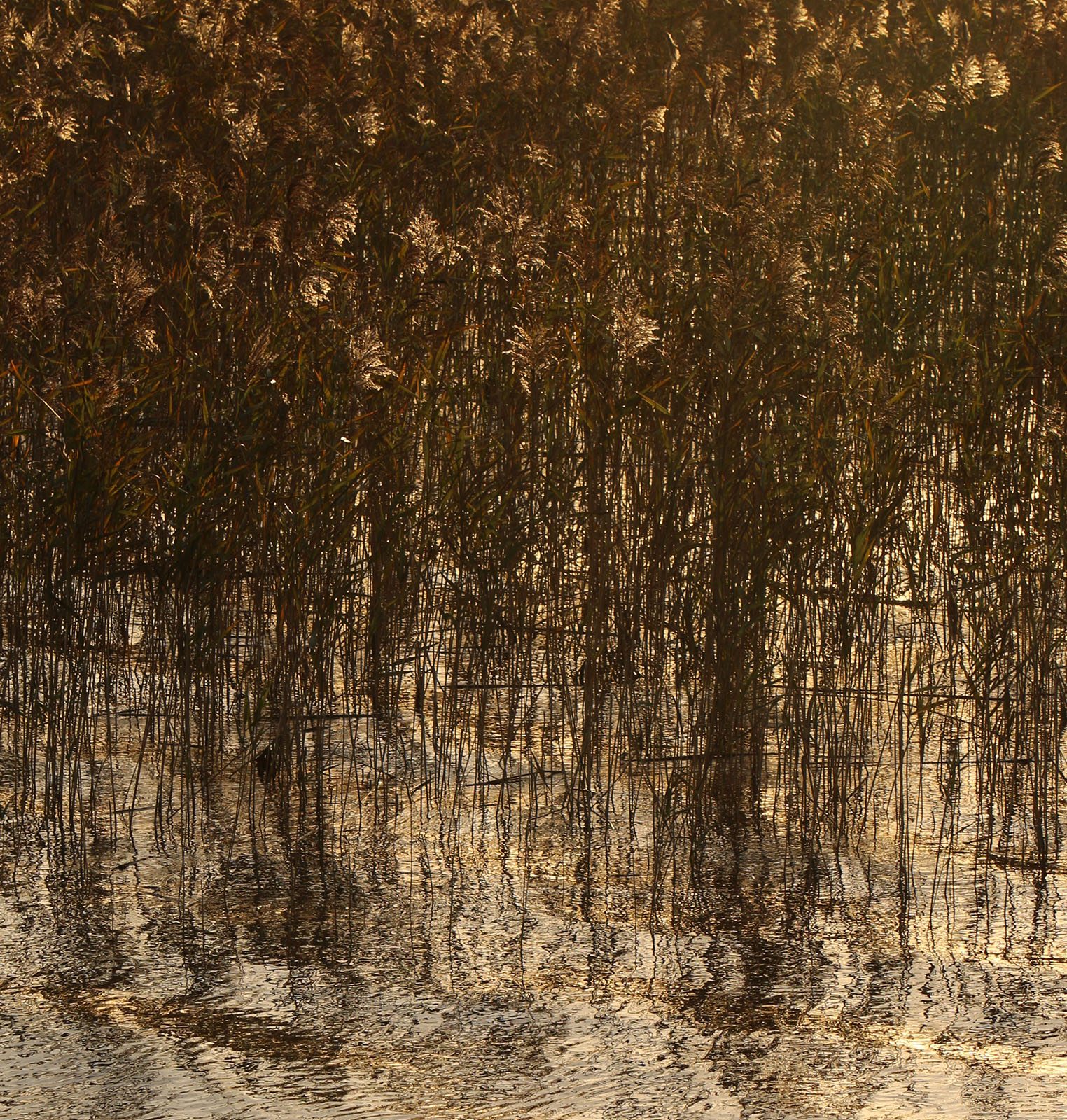 Autumn brown reeds hover above the reflection of the last bit of light in an October evening.