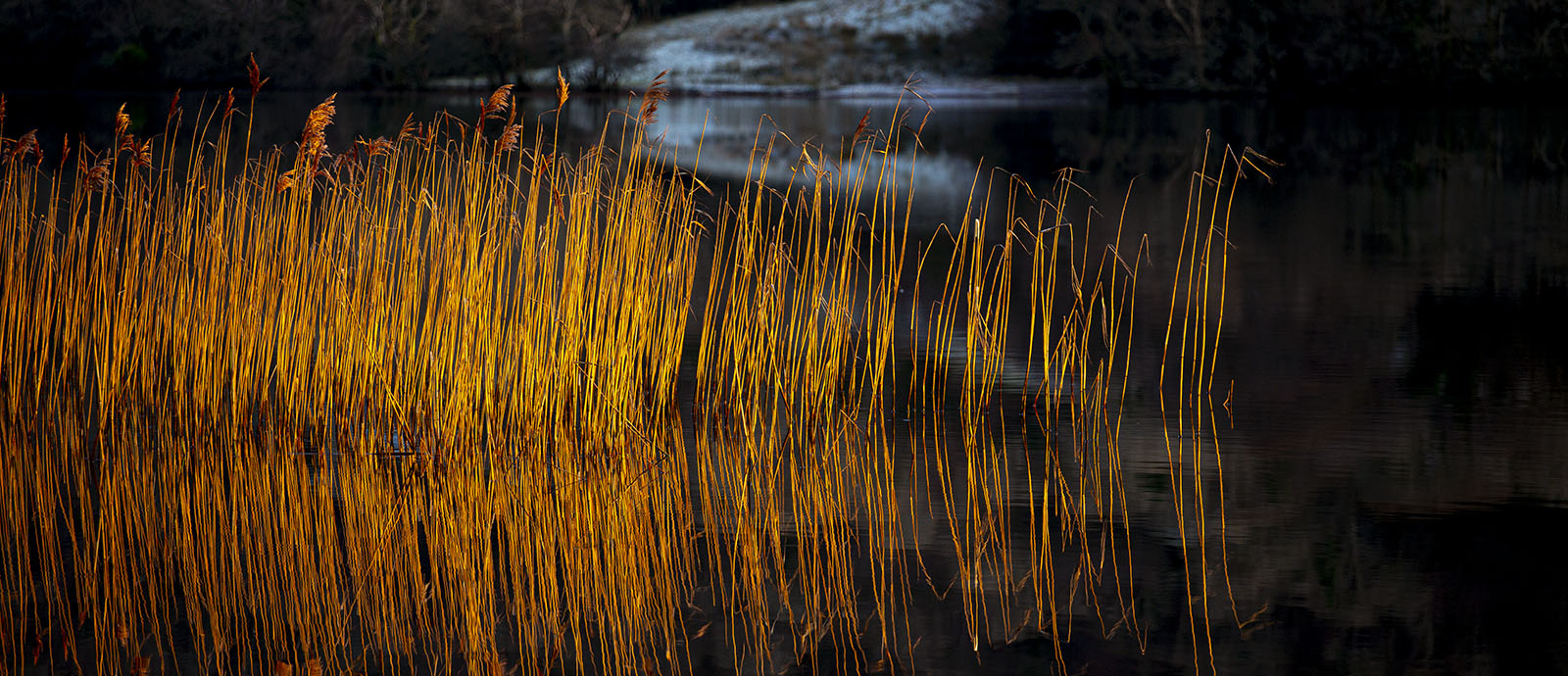 The last light of a winter day flashes golden rays on the reeds on the lake.