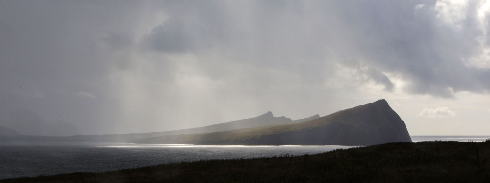 A veil of rain sweeps in from the ocean across the Three Sisters headland in Smerwick, Co. Kerry.